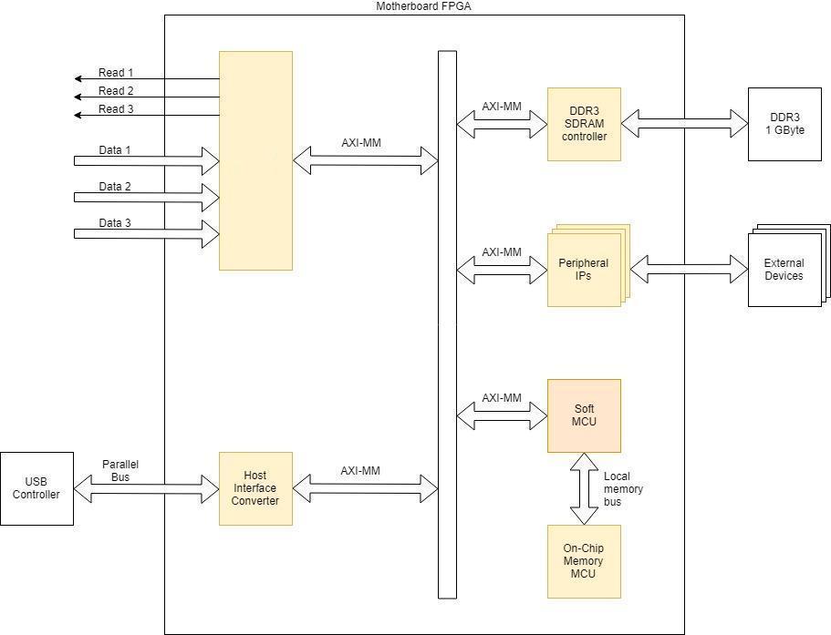 The Motherboard also contains an FPGA chip. Its main task is to collect data from all the measurement boards. At the core of the FPGA architecture is the AXI Memory Map system bus. All modules are connected to the AXI Memory Map, which provides flexibility and scalability of the system.