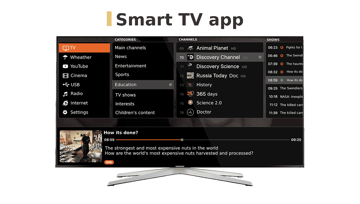 Our client was satisfied with our expertise. He received an IPTV application with the TimeShifting, EPG (electronic program guide), personal video recording (PVR), and pause/rewind features. Besides, a platform user has access to the entertaining categories: YouTube, Weather Forecast, CinemaRoom, Radio, and a Browser.