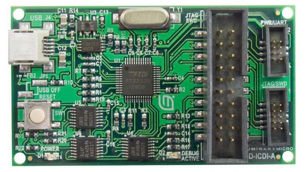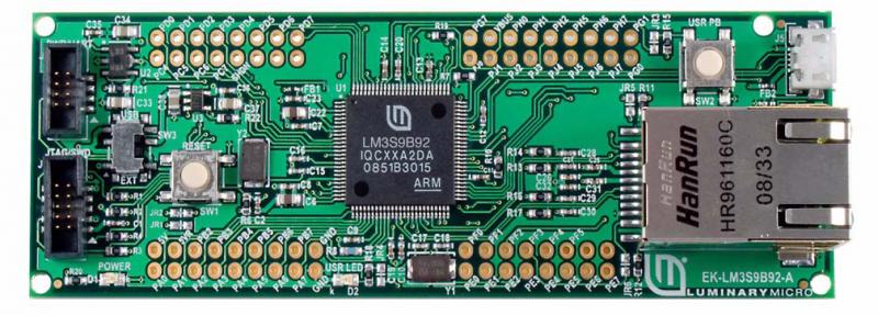 - A board itself with a target 32-bit microcontroller (Fig. 1) (the example features the EK-LM3S9B92 by TI) and an in-circuit debugger for the controller firmware (Fig. 2)